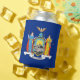Crafted with precision and care, this can cooler isn't just a beverage accessory; it's a symbol of New York's rich heritage and cultural identity. The striking design proudly showcases the flag of New York, with its vibrant blue field and the state coat of arms featuring two supporters: Liberty and Justice, a shield depicting a mountain sunrise, and a sailing ship, representing commerce.