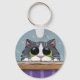 Great gift idea for any cat enthusiast. Keychain featuring a little grey and white cat peering inside while stuck out in the rain. Created from an original painting © 2008 Lisa Marie Robinson
