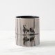 This mug features six migrating Canada Geese sitting on a log in a shallow pond. Their brown, black and white markings are reflected in the water. The water ripples create a fascinating vertical pattern of reflected tree trunks.
