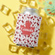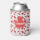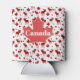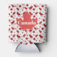 A Canadian themed pattern with moose and maple leaves. A large maple leaf is centred on the can cooler with Canada written in white lettering.
