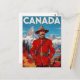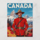 A striking and iconic vintage-style travel poster for Canada, featuring a proud Royal Canadian Mounted Police (RCMP) officer—the Mountie—in his classic red serge uniform. The backdrop showcases a rugged Canadian mountain landscape, including a lake, pine trees, and a distant castle. This bold illustration is perfect for lovers of Canadian history, national symbols, and dramatic retro travel art.