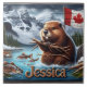 A Canadian beaver is busy holding branches near a mountain lake, with fish swimming and the Canadian flag waving in the breeze.