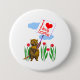 Pin with my design of a beaver character is holding a sign that says "I heart Nova Scotia" with a red heart and flowers.