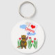 Keychain with my artwork of a beaver character holding a sign that says "I love Ontario" with a red heart.