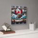 A Canadian beaver is swimming in a vibrant river, surrounded by mountains, greenery, and a Canadian flag backdrop during a sunny day.