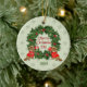 Festive Canadian Christmas design. Pretty Holly Wreath with red berries has two Canadian beavers in Mountie hats waving Canadian flags. Funny text says, Merry Christmas Eh! Light green maple leaf pattern background. Change date or delete.