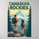 This design, titled "CANADIAN ROCKIES," functions as a retro-style travel poster that masterfully encapsulates the spirit of early 1970s adventure and the timeless allure of the Canadian wilderness. Its story is told through bold, simplified graphic elements: a stylised hiking couple confidently navigating a majestic mountain landscape, framed by towering pine trees. The dominant cool, muted colour palette of greens, blues, and greys, accented by a warm, sun-drenched sky, immediately evokes a sense of nostalgia, inviting viewers to imagine themselves embracing the freedom and natural beauty of the era.