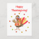 Postcard with my computer artwork of a cute little turkey wearing a Canadian Flag top with maple leaves around him. Text says "Happy Thanksgiving!"
