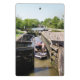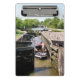 A photographic design of a canal narrowboat that has just entered the lock and waiting for the lock gates to close.