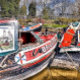 An art design of old moored narrowboats on the canal waiting for restoration.
