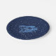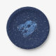 Paper plate featuring the symbol for Cancer in soft silver blue, overlaid with the stars of the constellation, against a starry sky background in deep midnight blue