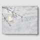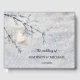 A winter wedding guest book featuring a candle lit lantern with snow covered branch in sparkling snow.