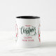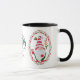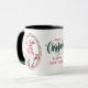 On two sides of this Holiday mug, a funny little gnome wears a pattern Santa hat with a sprig of holly, and lets a bird light on his hand. Beside him is the colourful text that says "JOY". A red and green candy stripe border finishes the design. At the centre of the mug is stylised text in red and green that says "Merry Christmas" and "Happy New Year".