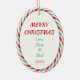 This cute Holiday ornament makes a fun gift for a child, especially a daughter, son, granddaughter,or grandson, or niece or nephew. On the front, a little white polar bear wears a red Santa hat, blue winter scarf, and blue ice skates. He carries a red and white striped candy cane. The image is framed with a pretty red, green, and white candy cane stripe pattern. The back of the ornament has the same striped frame, and several text fields for you to customise.