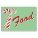 Decorate your Holiday or Christmas party with these retro style "Food" table cards featuring red writing with white details on a mint green background with red and white striped candy canes.