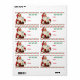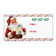 This gift package label features a vintage image of a classic Santa holding a gift package. The image is bordered top and bottom with a pretty red, green, and white candy cane stripe pattern. Green text says "HO HO HO" at the top right, and your custom text is in red below that.