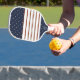 A basic striped pattern with a polka dot accents. This Pickleball Paddle features a bold red line with thinner green line, on either side. This combination alternates with a hairline black rule and a thick white band. At the top and bottom of this design there's a block of navy, with gold coloured dots.