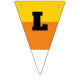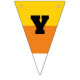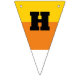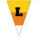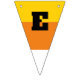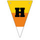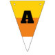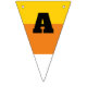 These triangle shaped bunting pieces have orange, yellow and white stripes to make them look like pieces of candy corn. Black letters spell out the message: HAPPY HALLOWEEN.