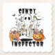 This image is a Halloween-themed design featuring a ghost in the centre, with the words "CANDY INSPECTOR" written in bold black letters below. The ghost is depicted with a friendly, cartoonish expression and is surrounded by various candy-themed elements, including lollipops, candy canes, and candy corn. On either side of the ghost are two jack-o-lanterns, each with a different expression. The jack-o-lanterns are filled with colourful candy, adding to the festive and playful atmosphere of the design. The background is transparent. Overall, the image is a whimsical and cheerful representation of the Halloween holiday, with a focus on the sweet treats that are often associated with the occasion.