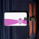 A classy tag for travelling featuring a candy pink ribbon with little heart accents.