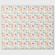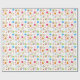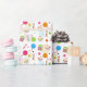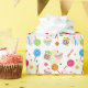 Wrapping paper featuring a candy themed pattern of cupcakes, polka dots, stick candy, gumballs, and lollipops.