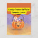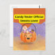 A fun, festive, and slightly spooky illustration perfect for Halloween. This design features a cheerful, smiling jack-o'-lantern candy bucket overflowing with a variety of classic sweets like lollipops, candy corn, and a chocolate-dipped treat. The warm orange and purple watercolor background, sprinkled with glowing fireflies, creates a magical "Trick or Treat" atmosphere. It's a sweet design for any "Candy Tester Official Sweets Lover" this spooky season!