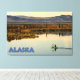 A canoe plies the mirror-still water of lake in the interior of Alaska. In the distance typical taiga and mountains. Text reading "Alaska" also appears. This image is derived from a United States Fish and Wildlife Service photograph.