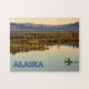 Alone in the wilderness. A canoe plies the mirror-still water of lake in the interior of Alaska. In the distance typical taiga and mountains. Text reading "Alaska" also appears. This image is derived from a United States Fish and Wildlife Service photograph.