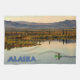 Alone in the wilderness. A canoe plies the mirror-still water of lake in the interior of Alaska. In the distance typical taiga and mountains. Text reading "Alaska" also appears. This image is derived from a United States Fish and Wildlife Service photograph.
