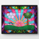 A digital stained-glass design in the Art Deco style popular in the 20th century. The widely-used sunburst motif is central, rising behind a green landscape balanced by a tree on one side and clouds and flowers on the other. Geometric shapes are used to emphasise the symmetry of the scene, with both the tree and clouds made of overlapping circles. Various brightly coloured fractals give the "glass" texture and interest. The scene is framed in black ironwork and diamond-shaped blocks frosted with dark but vivid fractal patterns.