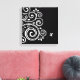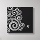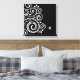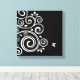 Wrapped canvas art is shown in a black and white art deco swirl graphic print.