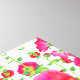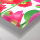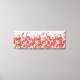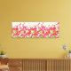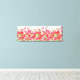 Wrapped canvas art is shown with a graphic print of pretty red and pink flowers on a white background colour.