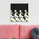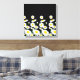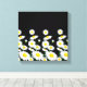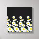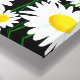 Wrapped canvas art is shown with a graphic print of pretty white daisies on a black background colour.