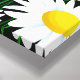 Wrapped canvas art is shown with a graphic print of pretty white daisies on a black background colour.