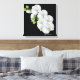 Wrapped canvas art is shown with a graphic print of pretty white orchids on a black background colour.