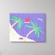 This wrapped canvas is designed with a depiction of a beach scene with palm trees, umbrellas, blue water, and a red sailboat.