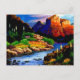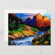 Painting of a river running though a canyon with high rocky cliffs and yucca plants at sunset.