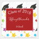 A great graduation themed sticker this design features a lovely background with black caps bright yellow, blue, purple and green stars and diplomas on a white background. In the centre is a red text box with your year, name, and school displayed in white text. Add text if you choose. Personalise your graduation stickers today!