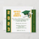 Graduation Invitation, Cap & Diploma theme, with class year and 'graduation party' in Green and Gold. The year and name text is in varsity font with 3d shadowing for the year. Back of invitation includes graduate name. Card can be personalised with your own images, artwork, etc.