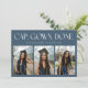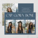 Modern and minimal graduation announcement photo card featuring 3 photos on the front and 1 on the back. The text at the top says "CAP. GOWN. DONE." Add the graduate's name, information, and message to personalize this card. Navy blue color.