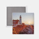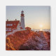 This photo features the rising sun behind the lighthouse along the rocky shoreline. A white fence helps to separate the lighthouse from the sea.