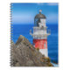 A vibrant and vivid photograph from the remote and magical Cape Palliser, New Zealand. This photo feature the top of a classic lighthouse wiith a red stripe and a rounded dome shaped roof. The perspective and angle of this photo is quite dramatic, showing the waves crashing down below giving the viewer a sense of the lighthouses height. The deep blue sea can be seen reaching out into the distance under a bright blue sky. The rugged coastal rocks of the area can be seen in the foreground. The gorgeous contrasting colours in this nature scene really make this image come alive.