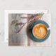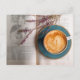 Cappuccino on a blue saucer on top of an illustrated flower book with a herbal purple sprig.