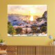 Capri island sunset watercolor painting showing a coastal town, harbor with boats, and reflecting sun over the sea