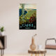 Vintage illustration European travel poster or luggage label from the Island Isle of Capri in Italy featuring a view from a villa of the island, , the beach, the beautiful coastline and the blue water of the Mediterranean Sea. Text reads Capri Italia.