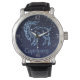 Watch featuring the zodiac symbol for Capricorn in soft silver blue, overlaid with the stars of the constellation, against a starry sky background graded from deep midnight blue to black.