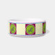 This is a heavy, durable bowl decorated with Tibbies of many colors, the perfect size for hungry/thirsty Tibs. The design is interesting and printing clear.