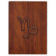 A Capricorn zodiac symbol in mahogany wood grain style print background. A modern urban racy design for a great custom birthday gift idea.
