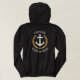 A custom designed (front and back) nautical boat anchor, gold style laurel leaves and a gold star with Captain rank or other title and your personalised name or boat name on a black hoodie. Makes a great gift.