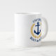 A Personalised giant 20-ounce coffee Mug with Captain rank or other title, your boat name, family name or other desired text. Featuring a custom designed nautical boat anchor, gold style laurel leaves and star emblem. Makes a great gift for any occasion.